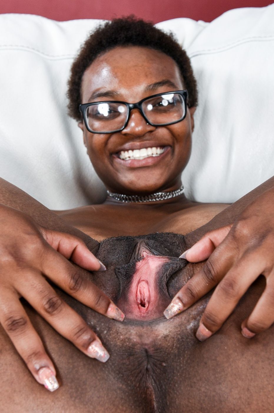 Ebony hottie with glasses fucks her black pussy